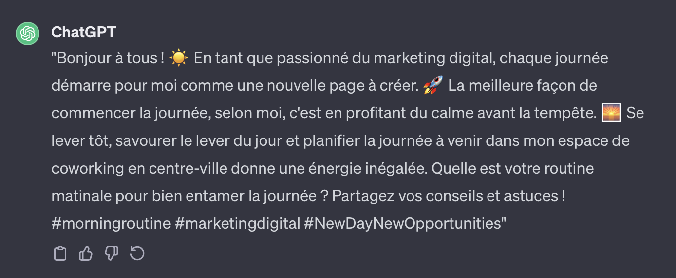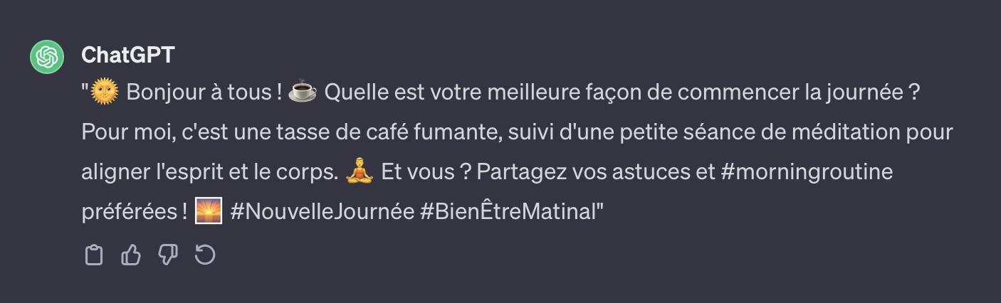 Voici 50 prompts gratuits pour créer du contenu sur Facebook, X et Instagram, en utilisant ChatGPT, Copilot ou en encore Google Bard. Il vous suffit de saisir le prompt dans la boîte de dialogue de votre générateur préféré, précédé d’une phrase de contexte type « Écris un post Facebook, en ajoutant de l’humour » et de laisser l’outil générer une suite de texte pour vous. Vous pouvez ensuite copier-coller le texte généré sur le réseau social de votre choix, en l’adaptant si besoin.